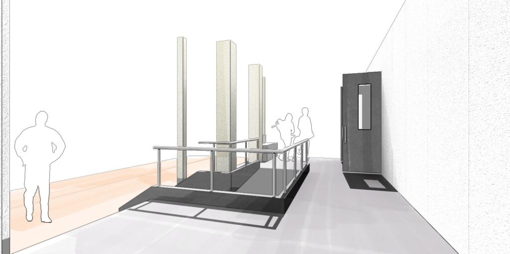 この学校は災害時の避難場所にも指定されているため、年配の方でも安心して使える勾配・幅・段差処理を意識して設計しています。